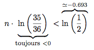 \underbrace{\ln \left( \frac{35}{36} \right)}_{\mbox{\footnotesize{toujours }}< 0}