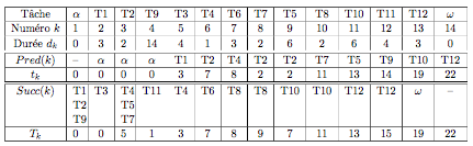 Tâche & $\alpha$ & T1 & T2 & T9 & T3 & T4 & T6 & T7 & T5 & T8 & T10 & T11 & T12 & $\omega$ \\