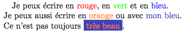Je peux aussi écrire en {\color{orange}orange} ou avec {\color{monbleu}mon bleu}. \\
