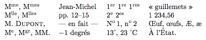 M\up{me}, M\up{mes} & Jean-Michel & 1\ier\ 1\iere\ 1\ieres & \og guillemets \fg \\